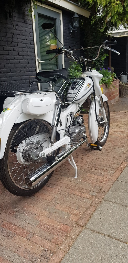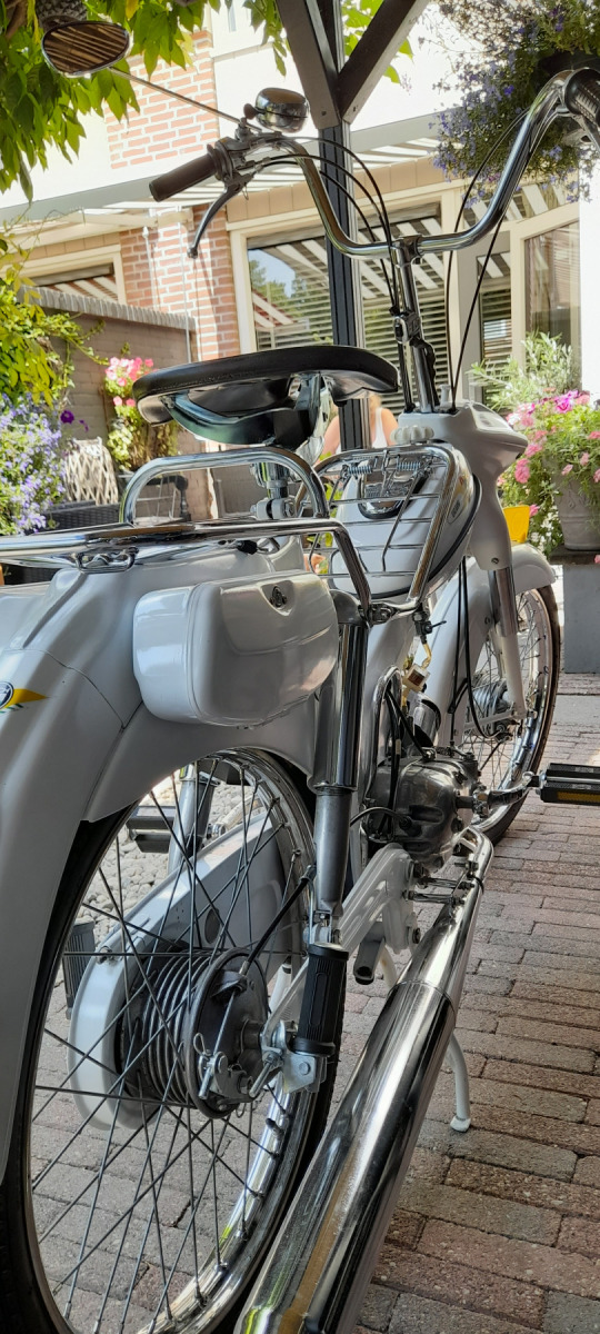 Puch opbouwen ◄ 1 2 Het frame van de Puch VS50D in aanbouw, motorblok, stuur, koplamp, filter, benzinetank en zadel moeten nog geplaatst worden.
